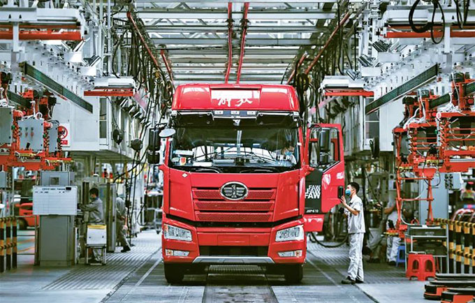 企業(yè)強則國家強,加快建設世界一流企業(yè)是全面建設社會主義現(xiàn)代化國家的重大任務,是新時代國有企業(yè)的戰(zhàn)略目標。近來,一汽解放集團股份有限公司生產(chǎn)按下“加速鍵”。圖為2022年6月15日,工人在位于吉林長春的一汽解放總裝車間內(nèi)裝配車輛。 新華社記者 許暢/攝