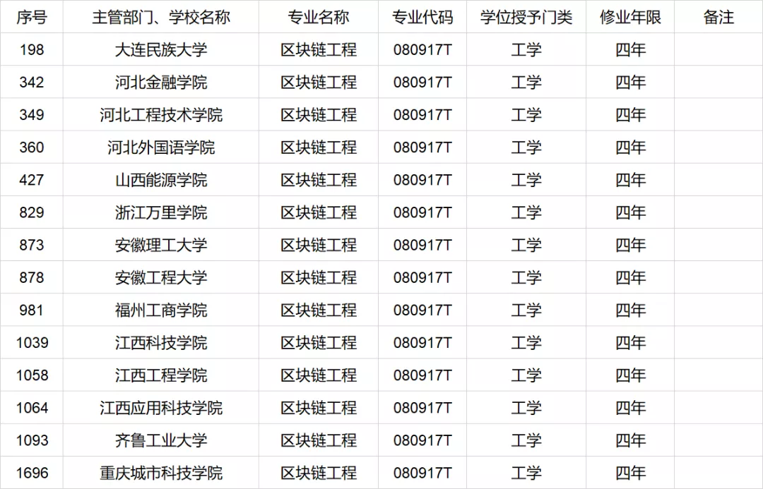 隨著區(qū)塊鏈在行業(yè)發(fā)展初期迎來(lái)短期爆發(fā)式的增長(zhǎng),必將面臨行業(yè)相關(guān)人才儲(chǔ)備不足,從業(yè)單位用人難的問(wèn)題。為此,2021年2月10日,中華人民共和國(guó)教育部《關(guān)于公布2020年度普通高等學(xué)校本科專業(yè)備案和審批結(jié)果的通知》(簡(jiǎn)稱《通知》)中公布,我國(guó)共有14家高等院校,申請(qǐng)開設(shè)了“區(qū)塊鏈工程”本科專業(yè)課程,持續(xù)為行業(yè)輸送后續(xù)力量,區(qū)塊鏈人才短缺問(wèn)題,將在幾年后得到有效緩解,并持續(xù)為行業(yè)輸送后續(xù)力量。本次公布的14家高校分別為大連民族大學(xué)、河北金融學(xué)院、河北工程技術(shù)學(xué)院、河北外國(guó)語(yǔ)學(xué)院、山西能源學(xué)院、浙江萬(wàn)里學(xué)院、安徽理工大學(xué)、安徽工程大學(xué)、福州工商學(xué)院、江西科技學(xué)院、江西工程學(xué)院、江西應(yīng)用科技學(xué)院、齊魯工業(yè)大學(xué)、重慶城市科技學(xué)院。